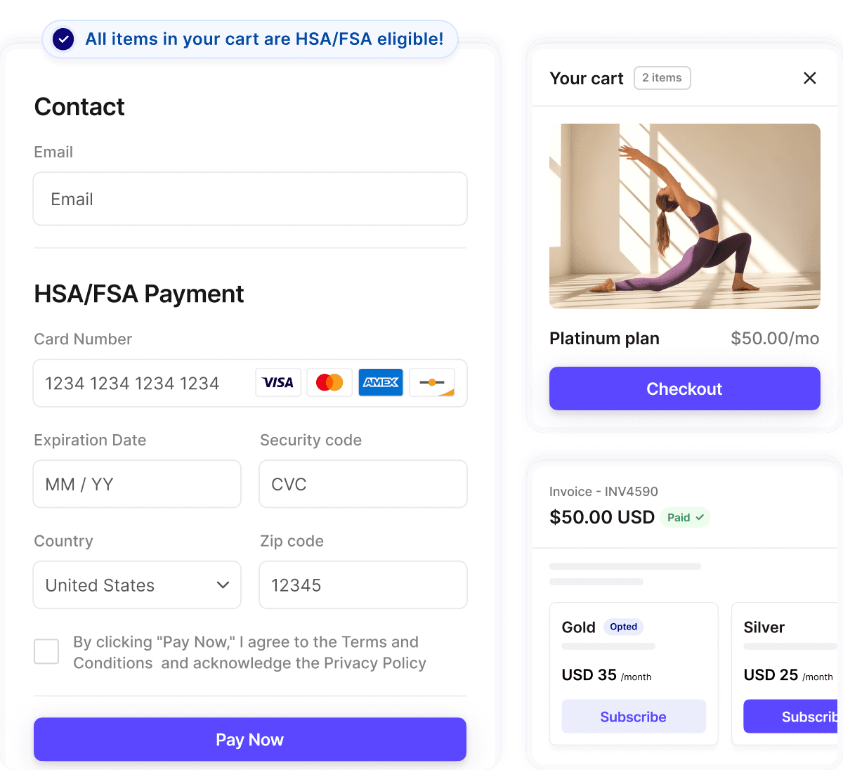 Enable seamless HSA/FSA payments for fitness products in-app or on your website. We handle the complexity of split cards, subscriptions, and more.